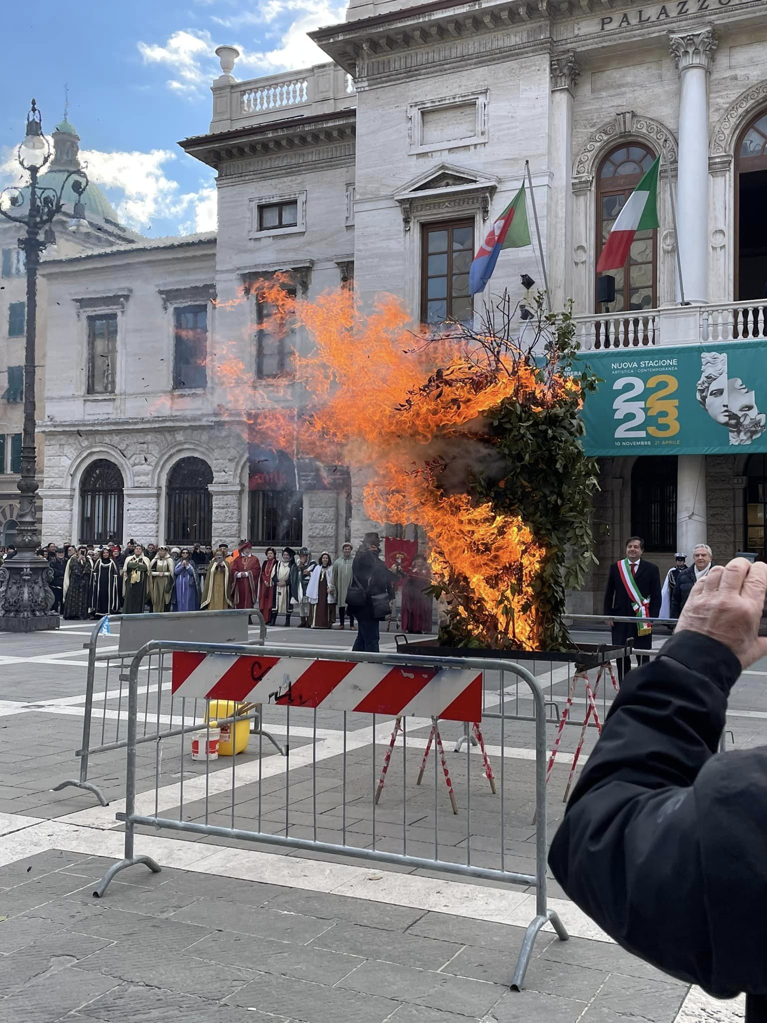 Una “colonna di fuoco” alta e perfettamente verticale. Sarà un 2023 fortunato per Savona, almeno questo è quello che sperano l’Amministrazione comunale e i savonesi che questa mattina hanno partecipato al Confuoco in piazza Sisto. Al tradizionale evento che precede il Natale immancabile come sempre lo scambio d’auguri tra il sindaco di Savona Marco Russo e il presidente dell’Associazione «A Campanassa» l’ «Abate» Dante Mirenghi.