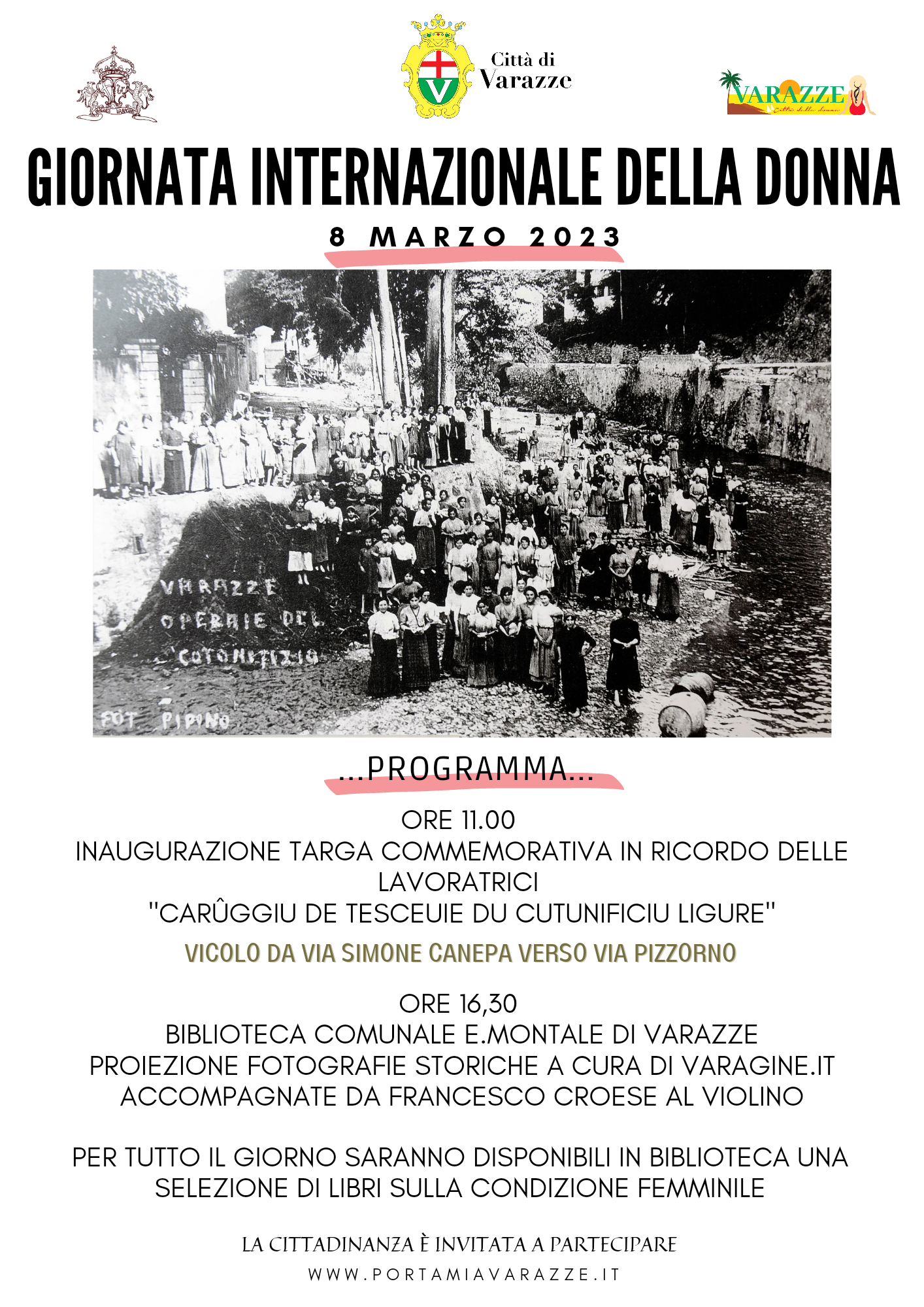 L’Amministrazione comunale di Varazze con l’Assessorato alla Cultura, ha deciso di celebrare questa giornata con due significativi e specifici eventi, che si terranno il primo al mattino e il secondo al pomeriggio di mercoledì 8 marzo 2023: