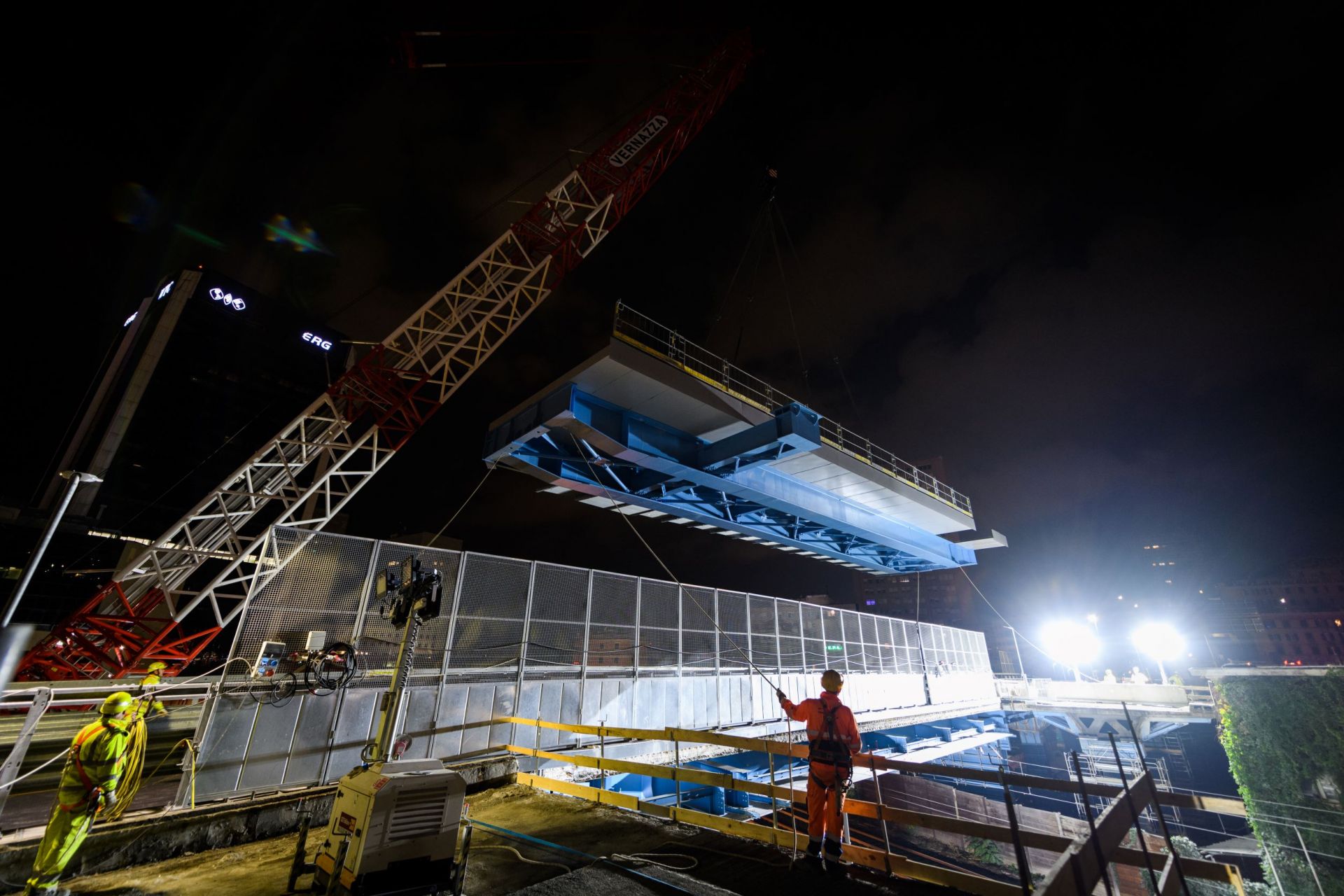 Nella notte tra sabato 11 e domenica 12 marzo l’impresa Vernazza per conto di AMPLIA S.p.A. ha montato una gru cingolata DEMAG modello CC3800-1 con 42 metri di braccio e una portata di 200 tonnellate, e questa mattina ha effettuato le operazioni di varo degli impalcati metallici, già preassemblati a piè d’opera all’interno dei cantieri.