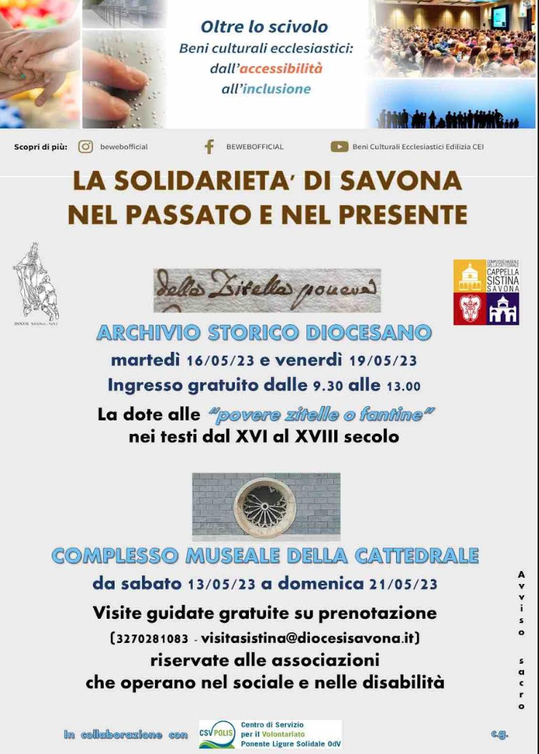 In occasione delle Giornate di valorizzazione del Patrimonio culturale ecclesiastico, indette dalla Conferenza Episcopale Italiana con il tema “Oltre lo scivolo – Beni culturali ecclesiastici: dall’accessibilità all’inclusione”, la Diocesi di Savona-Noli presenta due iniziative dal titolo “La solidarietà di Savona del passato e nel presente”.