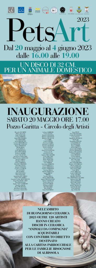 Oltre 120 artisti, nell’ambito della manifestazione “Buongiorno Ceramica 2023”, hanno creato dei tondi di 32 centimetri di diametro, riproducendo il tema degli animali domestici o da compagnia secondo le proprie tecniche e i propri criteri artistici, per la ottava edizione della manifestazione. Da sabato 20 maggio (con inaugurazione alle 17,00), è possibile ammirare ed acquistare tramite offerta, le opere che saranno in esposizione fino a domenica 4 giugno. Naturalmente i primi visitatori saranno privilegiati perché avranno una migliore e più ampia possibilità di scelta. L’intero ricavato (il Comune ne ha sostenuto interamente i costi) sarà devoluto alla Caritas Parrocchiale per le famiglie in difficoltà. E’ previsto un orario di apertura dalle 16 alle 19 con festivi anche dalle 10 alle 12,30 e, fuori orario di apertura, la mostra potrà essere visitata tramite richiesta ai seguenti numeri:338 6127404 e 3475712373. All’interno della mostra troverete le indicazioni circa le varie possibilità di offerta.