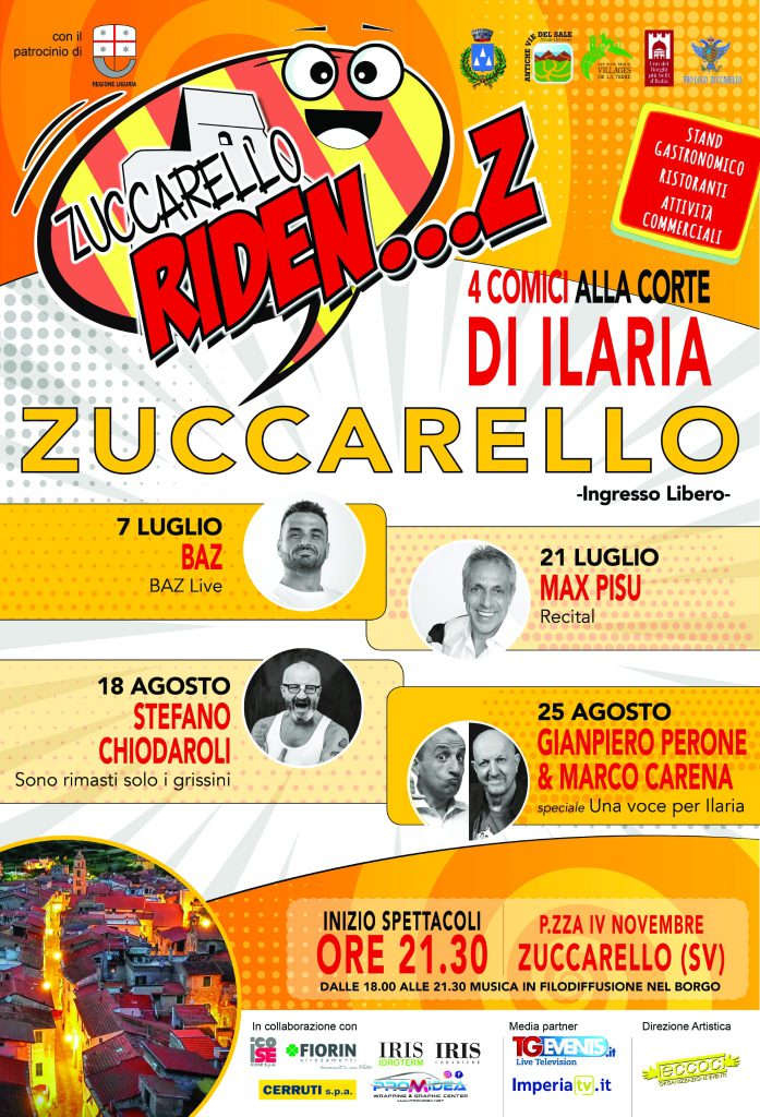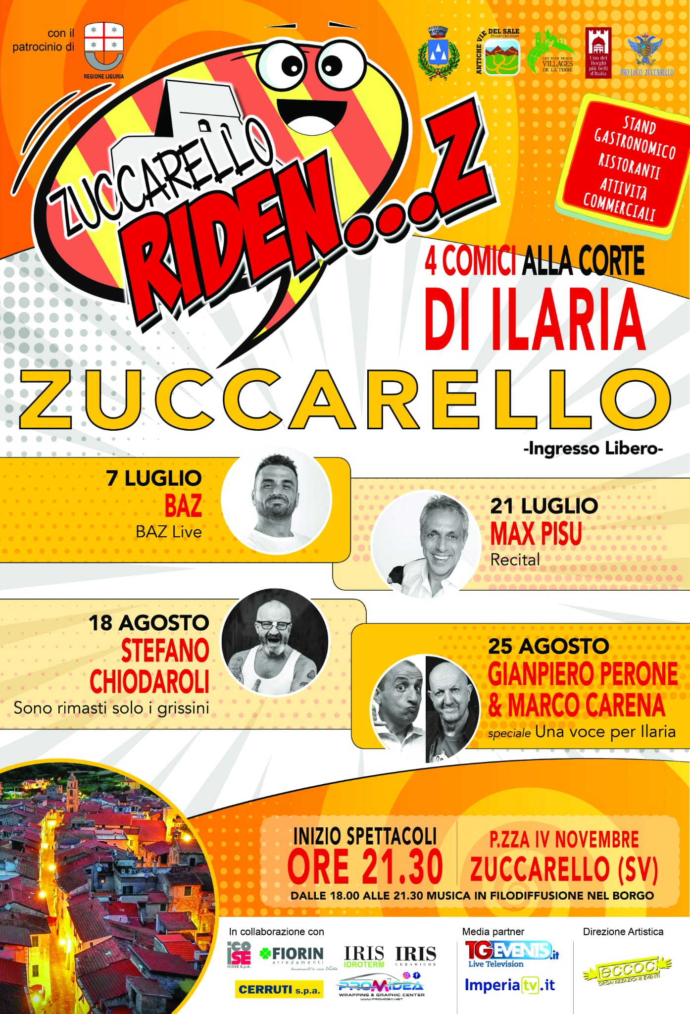 Estate con noi torna #zuccarelloridenz 4 risate con campioni della risata come… BAZ Marco Bazzoni (venerdì 7 luglio) – MAX PISU (venerdì 21 luglio) – Stefano Chiodaroli (venerdì 18 agosto) – Gianpiero Perone e Marco Carena (venerdì 25 agosto)… Comune di Zuccarello (SV) I Borghi Piu’ Belli D’Italia … Stand gastronomico, ristoranti e attività commerciali in festa! Evento ad ingresso libero vi aspettiamo come sempre numerosi.