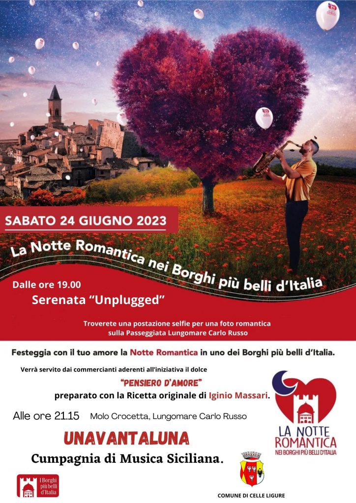 Il Comune di Celle Ligure presenta il calendario dell’estate 2023, un programma sicuramente ricco e variegato che verrà “lanciato” sabato 24 giugno con la partecipazione del comune alla notte romantica dei borghi: dalle 19.00 serenata improvvisata in un angolo del centro storico da scoprire e dopo un selfie “da incorniciare” sulla passeggiata ed aver gustato, dai ristoratori aderenti, il dolce “Pensiero d’amore”, il concerto degli “Unavantaluna” compagnia di musica siciliana, sul molo.