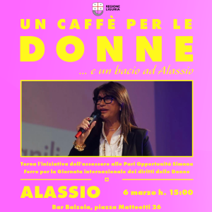 In occasione della Giornata Internazionale dei Diritti delle Donne che si celebra l’8 marzo, l’Assessore alle Pari Opportunità di Regione Liguria, Simona Ferro, interverrà ad Alassio nell’ambito dell’iniziativa “Un caffè per le donne – edizione 2024”.