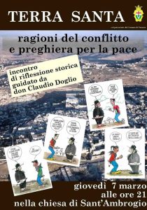 A Varazze con il patrocinio del Comune giovedì 7 marzo alle ore 21 nella Chiesa Sant’Ambrogio Vescovo don Claudio Doglio, parroco, biblista e docente alla Facoltà Teologica dell’Italia Settentrionale, guiderà l’incontro di riflessione storica “Terra Santa. Ragioni del conflitto e preghiera per la pace”.